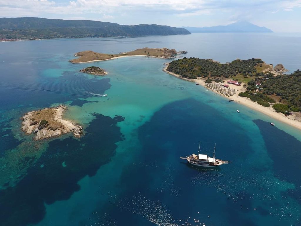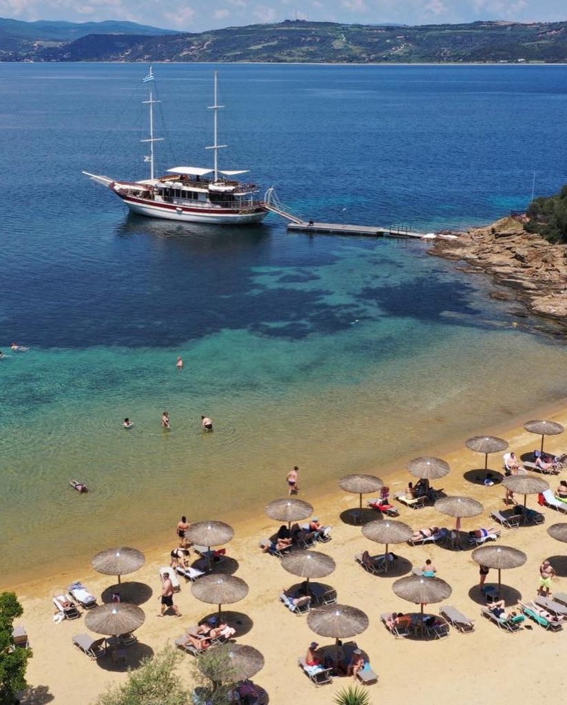 The itinerary typically includes a stop at the village of Ammouliani, where guests can explore the island or relax by the sea, followed by a visit to an organized beach for swimming and dining. The experience concludes with extended swimming stops in the turquoise waters of the Lagonisi bay, where passengers can dive directly from the vessel and enjoy crystal-clear waters surrounding the ship.